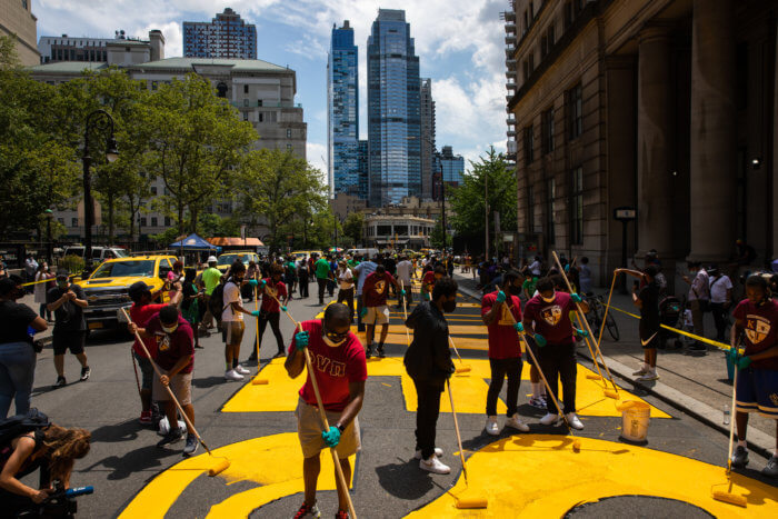 “By putting ‘Black Lives Matter’ in the oldest governmental building in Brooklyn at the crossroads of the Supreme Court, the Criminal Court and where people come to make noise and ensure laws are carried out, we are saying in a very clear and pronounced way that every time you drive down this street as a judge, every time you walk this block as a lawyer, every time you visit this building to get a building permit that throws out Black and Brown people — you’re going to see that Black lives matter,” Adams said. “Every time you visit the Department of Education while our classrooms are segregated more now than ever, you’re gonna know Black lives matter. Every time you go to jury duty and make a determination on a sentence that is handed down more on Blacks than any other group, you’re gonna know Black lives matter.”