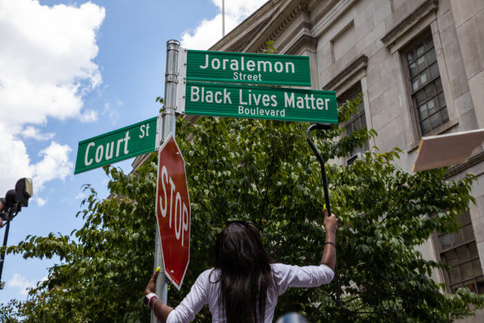 The demonstration — which included a live painting of the mural, and more than a dozen speeches by local elected officials and advocates — was capped with the uncovering of the new street sign at the corner of Court and Joralemon streets. The new additions will serve as a reminder not only to passersby, but more importantly to judges, legislators and other decision-makers working out of nearby buildings that Black lives matter, speakers said.