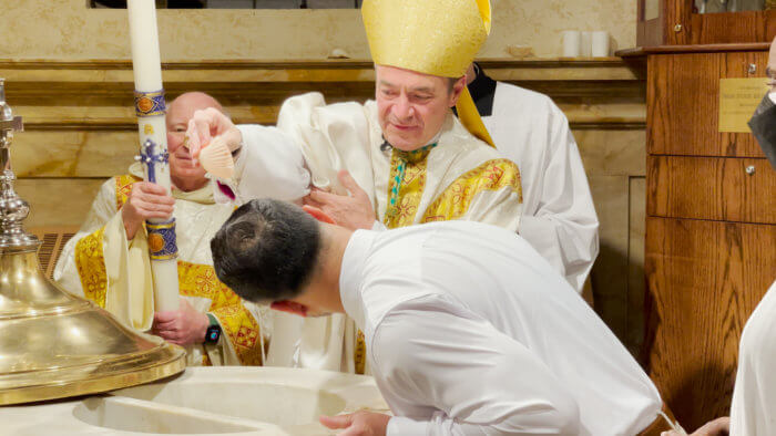Bishop Brennan baptized five new members into the church and confirmed six more during Saturday night’s vigil.
