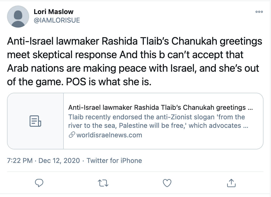 Earlier that year on May 6, Maslow tweeted at Rep. Tlaib: “Stop ‘dehumanizing the Palestinian people?’ Easy answer there. When they start acting like humans. You are an anti Semite.”