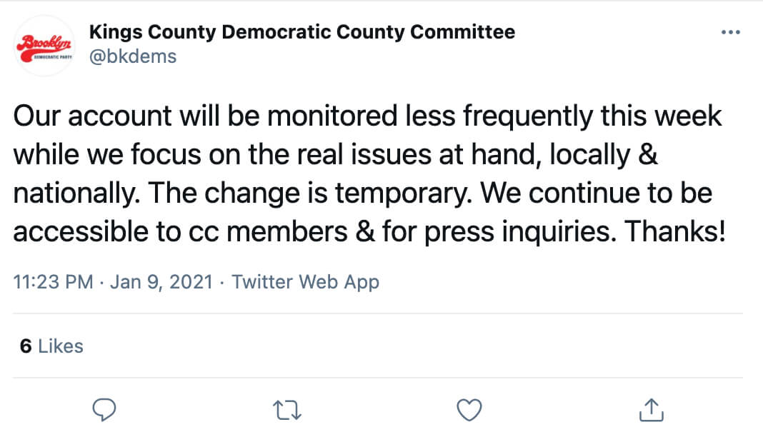 In the run-up to the party’s first public event since its 26-hour two-part full membership Zoom meeting in December, party officials also unlocked the Brooklyn Dems Twitter account Sunday, following two weeks during which it was in private mode since Jan. 9 to “focus on the real issues at hand, locally and nationally,” the Democrats said at the time.