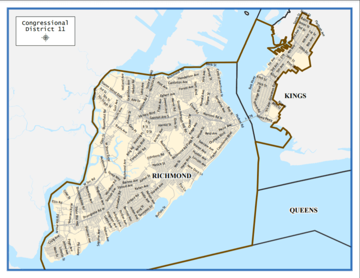 The 11th District, represented by Republican Nicole Malliotakis and which currently includes Staten Island and a chunk of southern Brooklyn, has been redrawn to shift its Brooklyn section into more reliably Democratic territory. The Brooklyn section currently includes conservative southern Brooklyn nabes like Bay Ridge, Dyker Heights, Bensonhurst, and Gravesend, but the new maps shift the district boundaries to the west, to instead cover Bay Ridge, Sunset Park, Gowanus, and Park Slope.