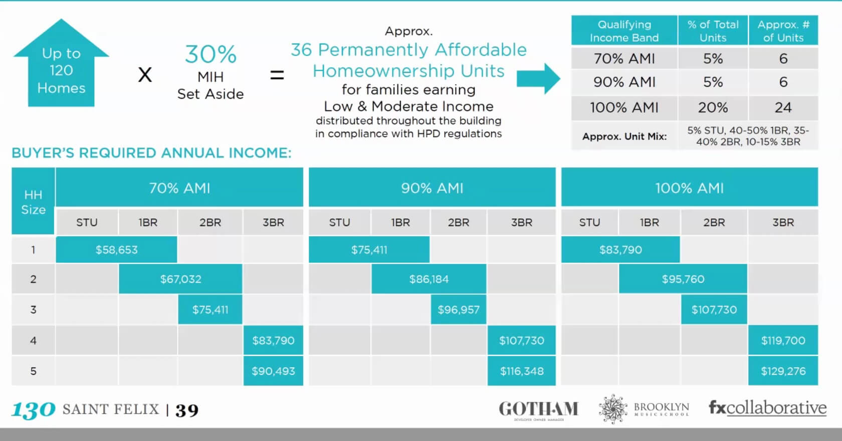 A dozen of those will target folks making 70-90 percent of the federally-set Area Median Income, which equates to a salary of between $58,653–116,348, depending on the size of the household. The remaining 24 will go for people making 100 percent of the AMI, or about $83,790-$129,276.