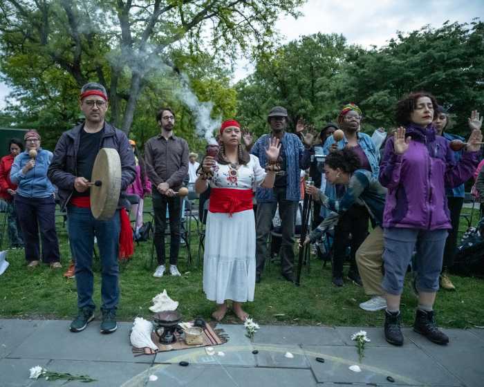 Thursday’s ceremony began with a purification ritual, followed by a solemn walk along the memorial display. A New Orleans-style procession, led by the Brass Queens, then made its way to Green-Wood Cemetery’s Historic Chapel for a dedication and ritual circle featuring speeches, a Mexican butterfly dance performed by Mazarte Mexican Dance Company, and the naming of the lost.