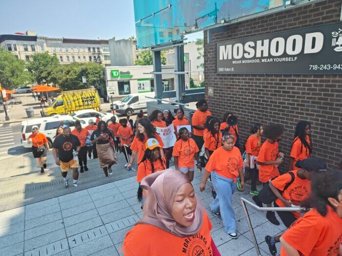 Launch Charter School students held the protest, which led them down Fulton Avenue to a rally at Restoration Plaza, marking the 8th annual event the middle school has organized to mark Gun Violence Awareness Day.