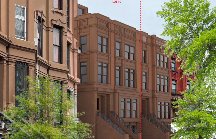 Both designs are four-story brick and brownstone buildings with similar details, but the one for No. 164 is wider and longer, plans presented to LPC by architect Ana Maria Torres of AT Architects and preservation consultant Jacqueline Peu-Duvallon show. Torres said that came down to the lot being bigger. She added that it is still designed below FAR to stay in context with the surrounding historic buildings.