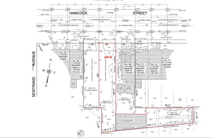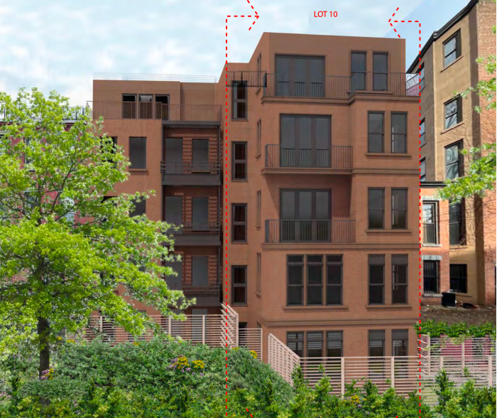 The lot at 164 Hancock is substantially larger than 162 and 168 Hancock as it includes much of the L-shaped site at the rear of the mansion, meaning the developer could build a larger building. While the plans show the height of the proposed new building at 164 Hancock will be the same as the planned building at 162, all four stories would extend 20 feet further into the backyard than the existing Neo-Grec manse at No. 168.