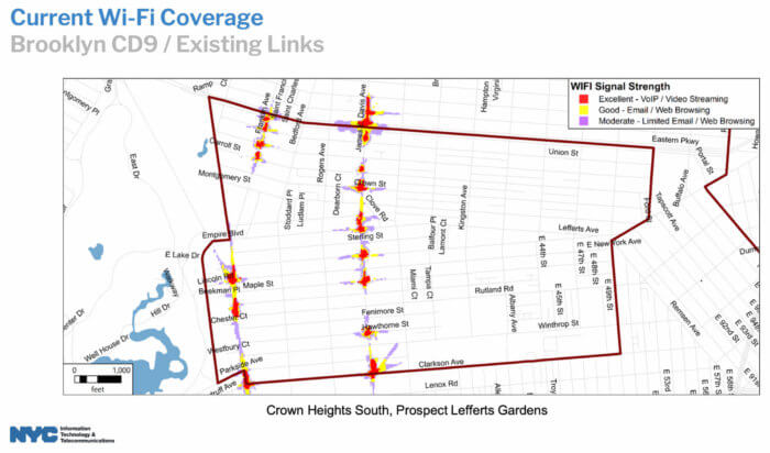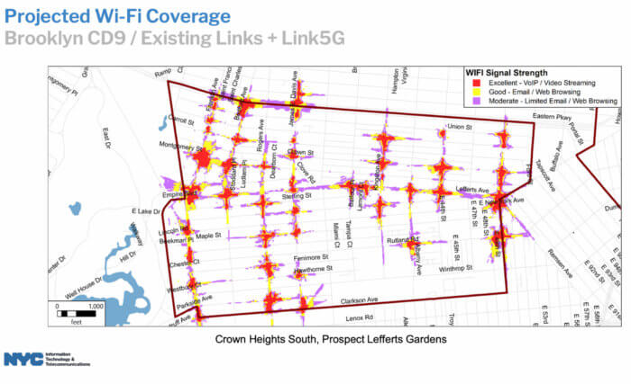 A total of 2,000 5G transmitting towers will be installed across the city, with 90 percent going to the outer boroughs and above 96th Street in Manhattan in an effort to bring high-speed Internet to areas that have lacked it. Five years ago, nearly 20 percent of New York City households — more than 1.5 million people —- lacked both cell phone service and Internet, according to a 2017 study cited in the city’s 2020 Internet Master Plan. Five community districts in Brooklyn were categorized as “Internet deserts,” meaning 22 percent to 32 percent of households had no Internet service.