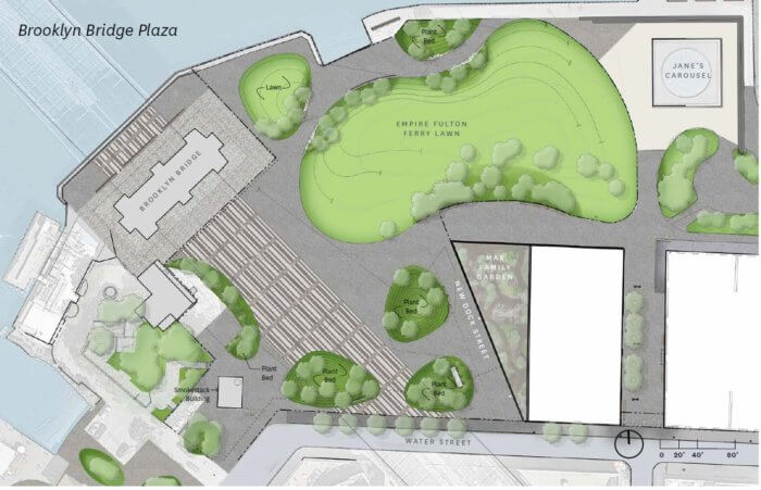 The new plaza and the paths will provide an easier connection from the park to Dumbo, where before park goers are currently forced to go around the fenced off lot along Water Street.