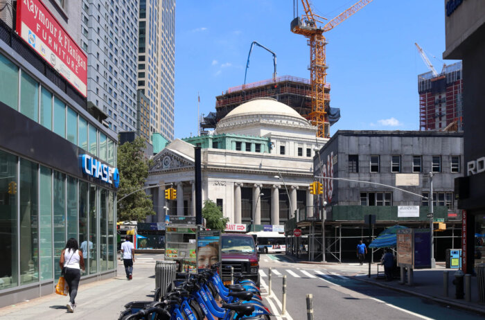 As part of the new development, the Dime Savings Bank, already one of Brooklyn’s most notable buildings and both an exterior and rare interior landmark, is getting a full interior and exterior renovation. It includes restoration of the rotunda and original marble floors, the addition of new marble floors, rearranged teller counters, and new double-paned windows.